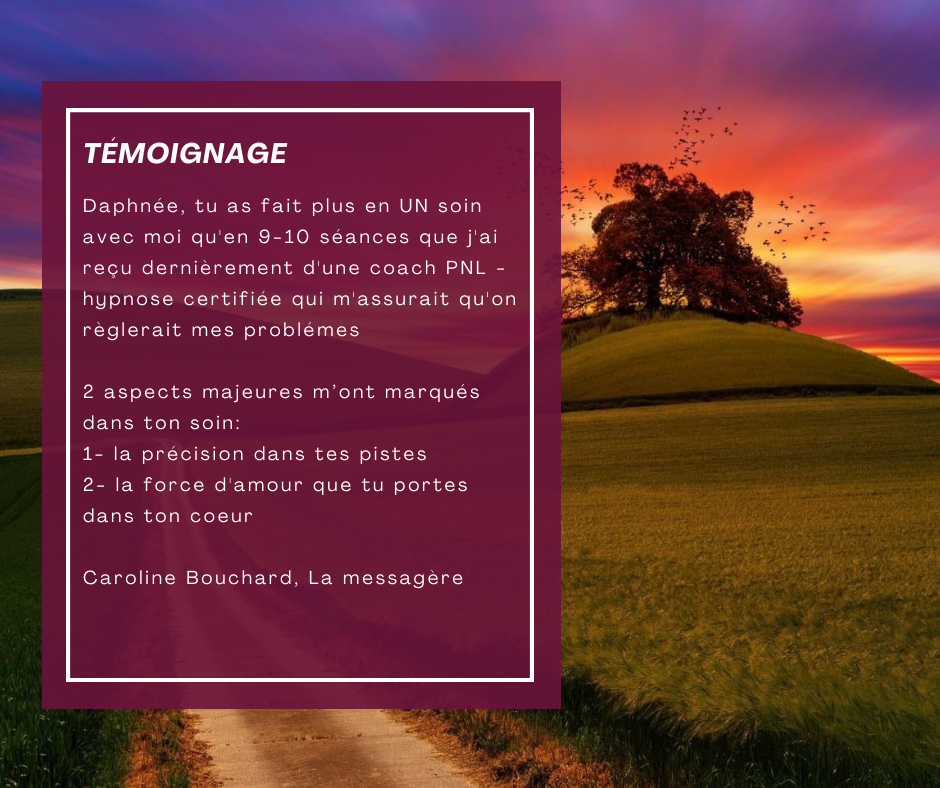 Mon approche? Essentiellement intuitive, j’utilise mes outils de prédilections comme la voix, Succès InfinitTM, la canalisation et l’alignement énergétique pour s'outiller afin de reprendre ton pouvoir personnel.